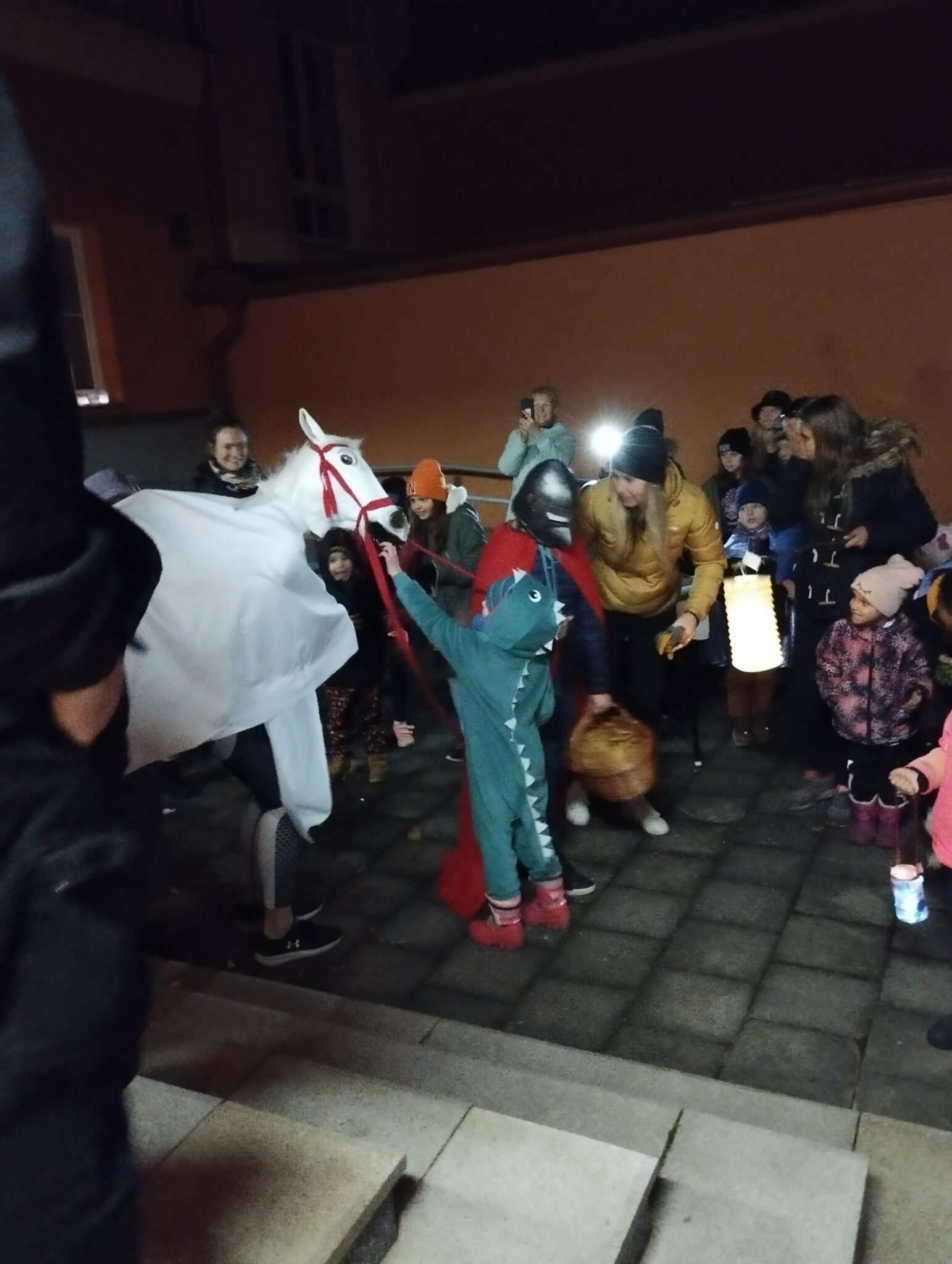 V předvečer svátku všech Martinů nás překvapil tajemný rytíř svým příchodem, dokonce vedl za uzdu svého věrného koně. Vůbec netušíme, kde se u nás ve škole celou dobu ukrývali :-D!