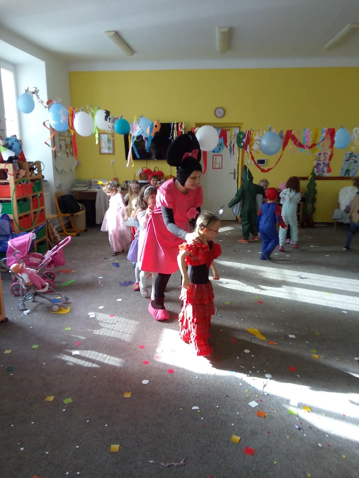 a další pohádkové postavy. Nechyběla ani masopustní svačinka v podobě koblížků. Nejdříve jsme začali promenádou všech masek. Po té náš průvod masek obveselil paní kuchařky i všechny ve škole. Následovalo karnevalové dovádění, tančení a soutěžení. Děti čekalo i drobné občerstvení a odměny.