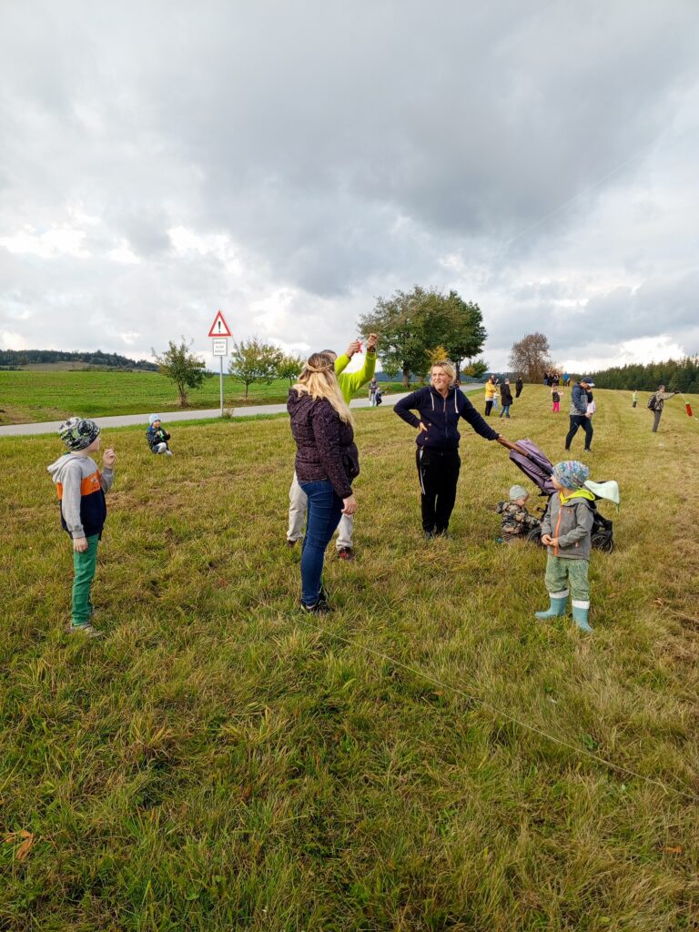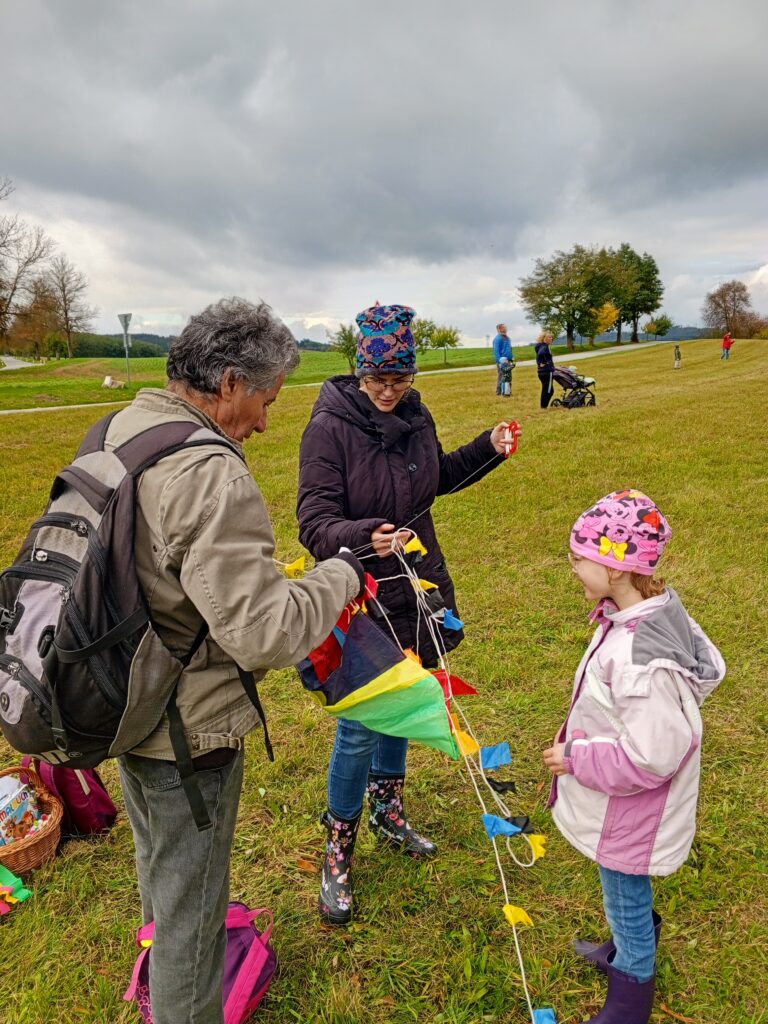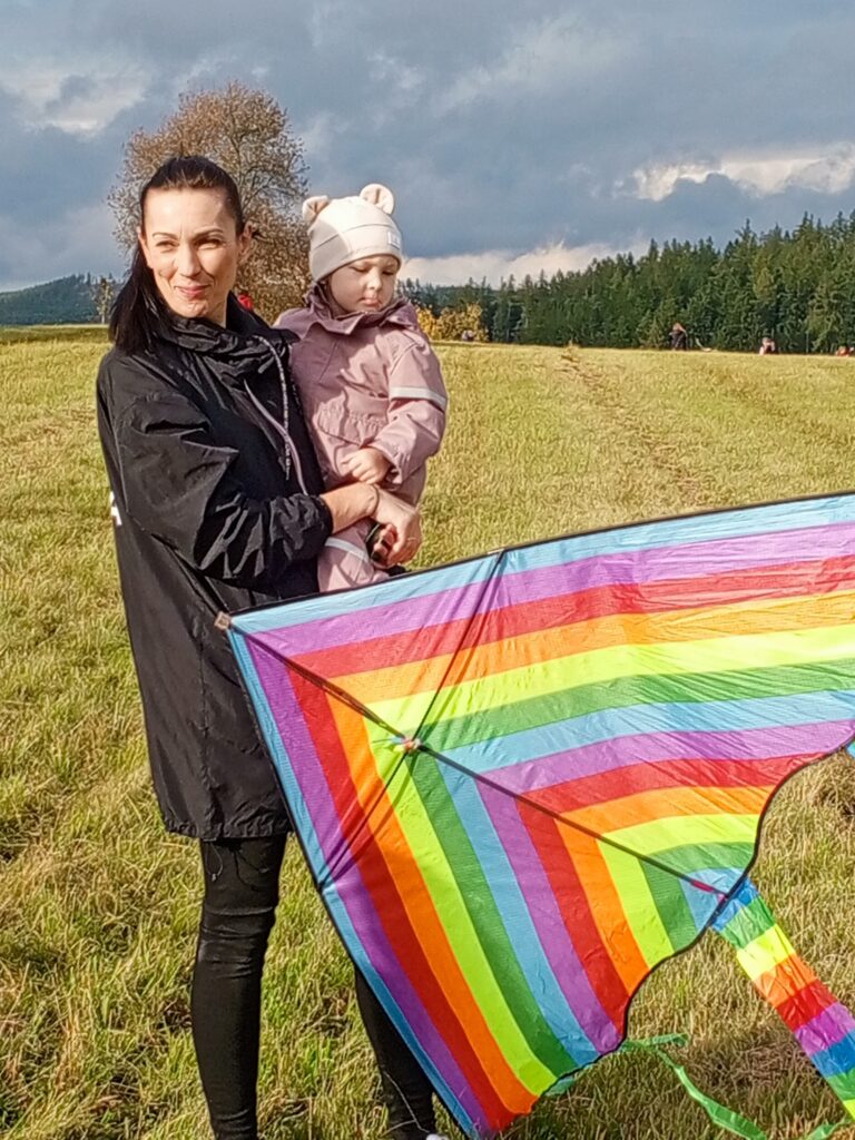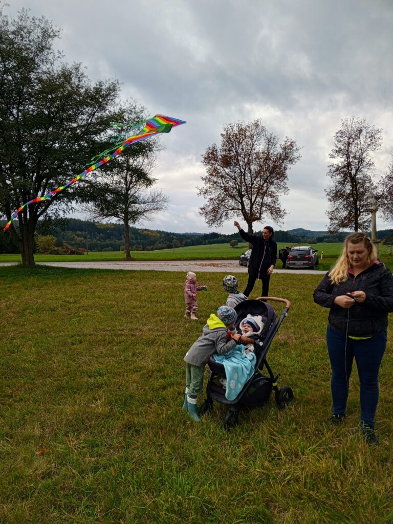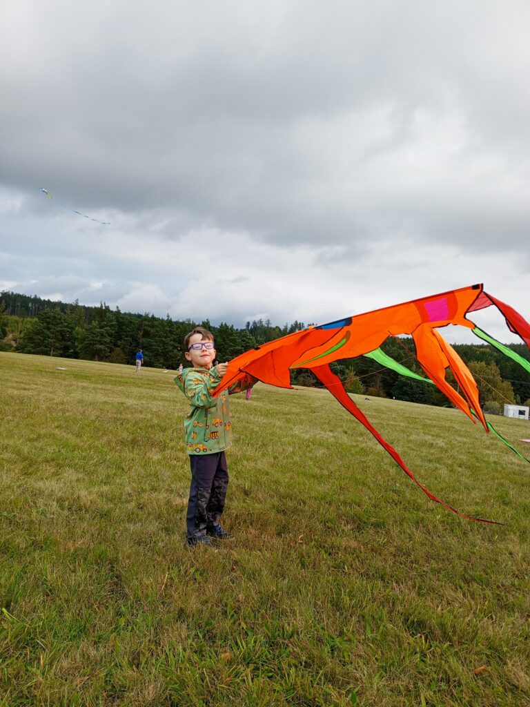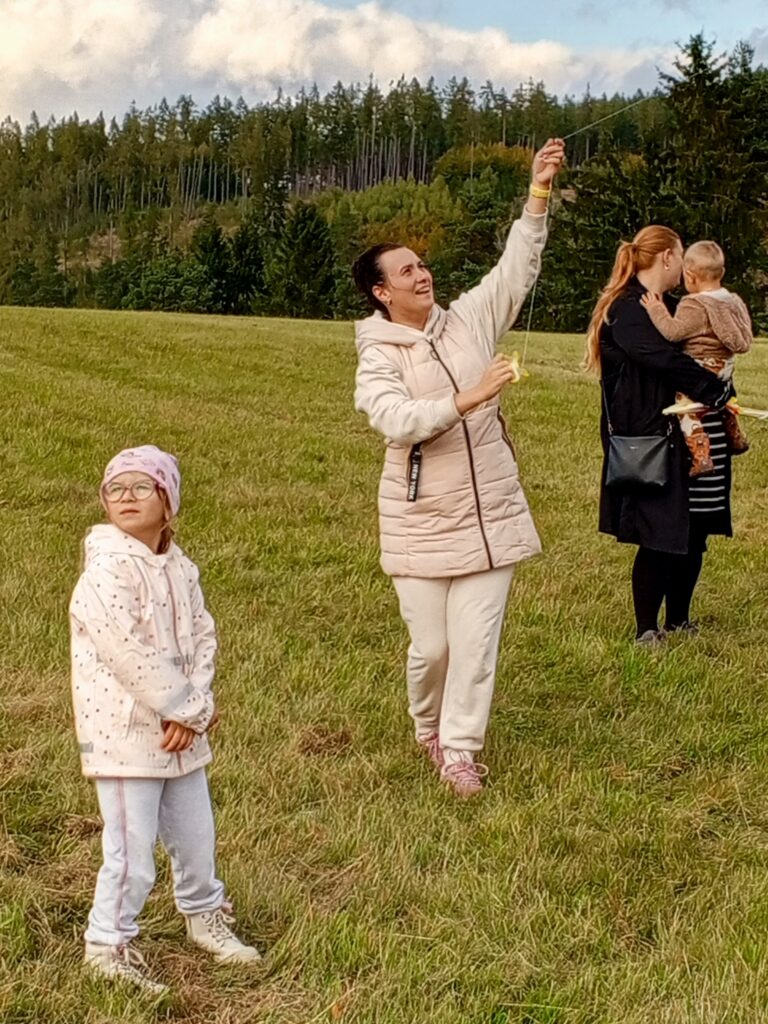 Při čtvrtečním slunečném odpoledni se na nedaleké louce sešli děti, rodiče i prarodiče, aby společně vypustili do oblak barevné dráčky všech barev i velikostí.