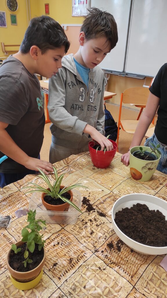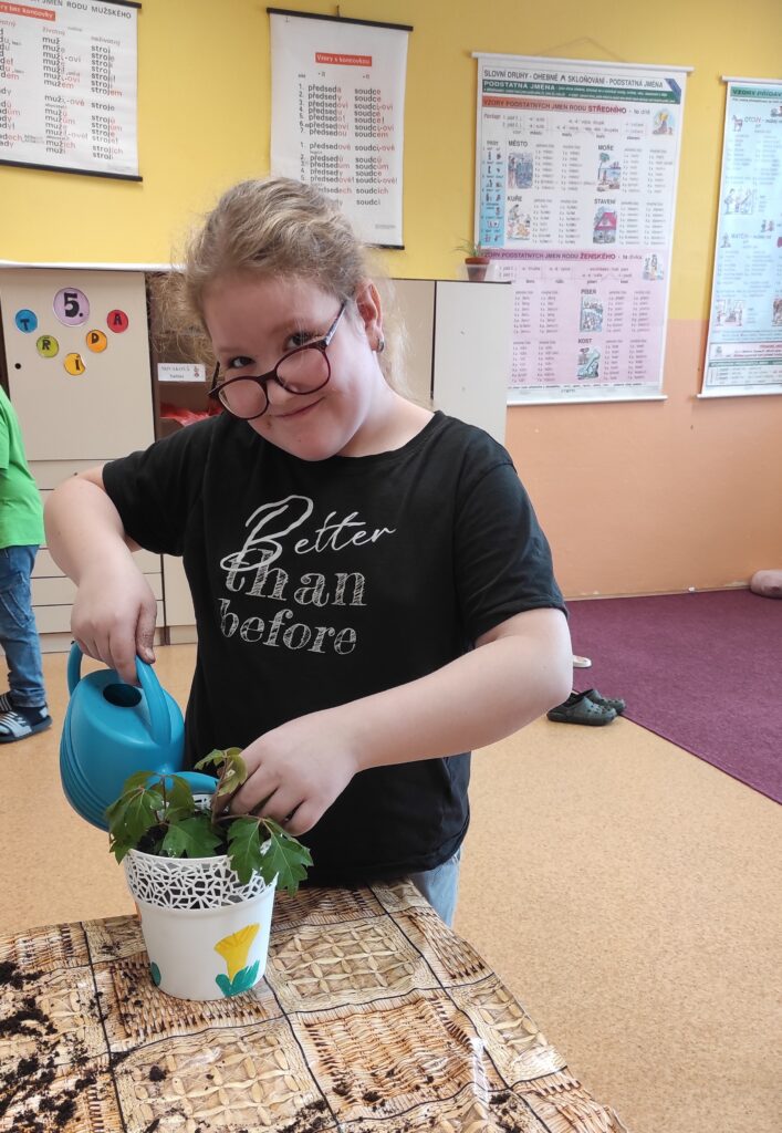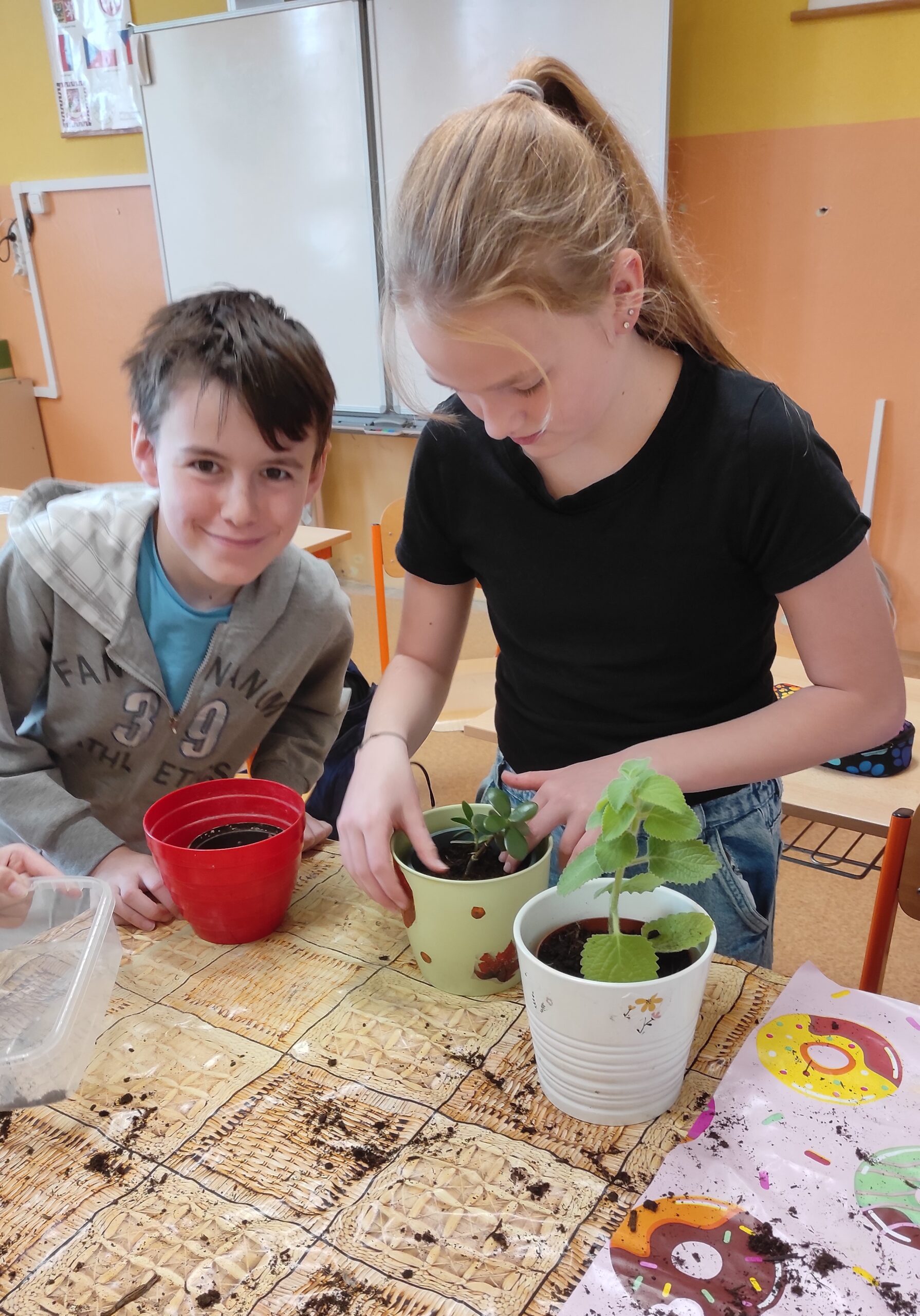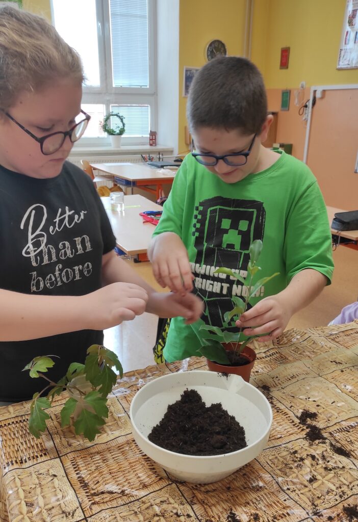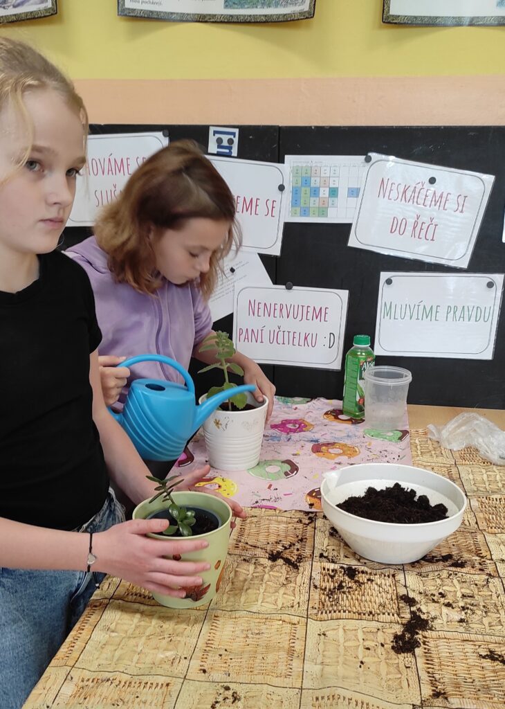 Žáci 4. a 5. třídy si v rámci pracovní výchovy kreativně ozdobili květináče, do kterých v následující hodině zasadili přinesené sazenice. Během školního roku se o své rostlinky budou starat – pravidelně je zalévat, kypřit půdu a hnojit. Těšíme se, jak se jejich pěstitelské úsilí bude vyvíjet!