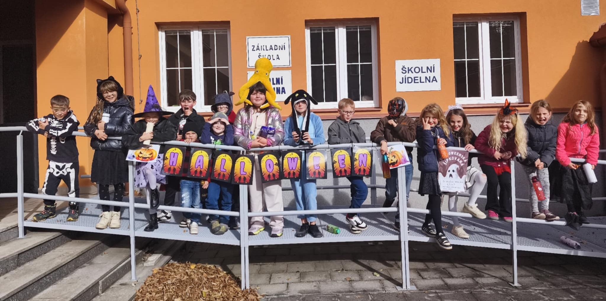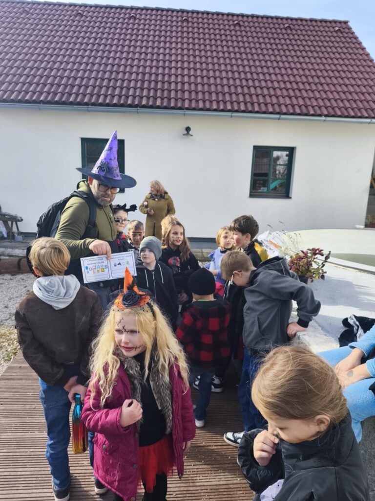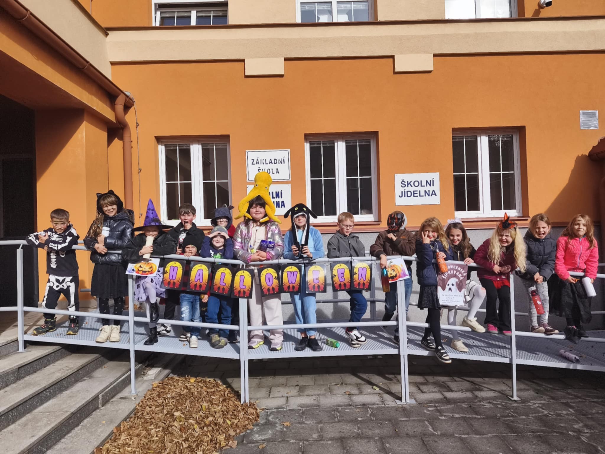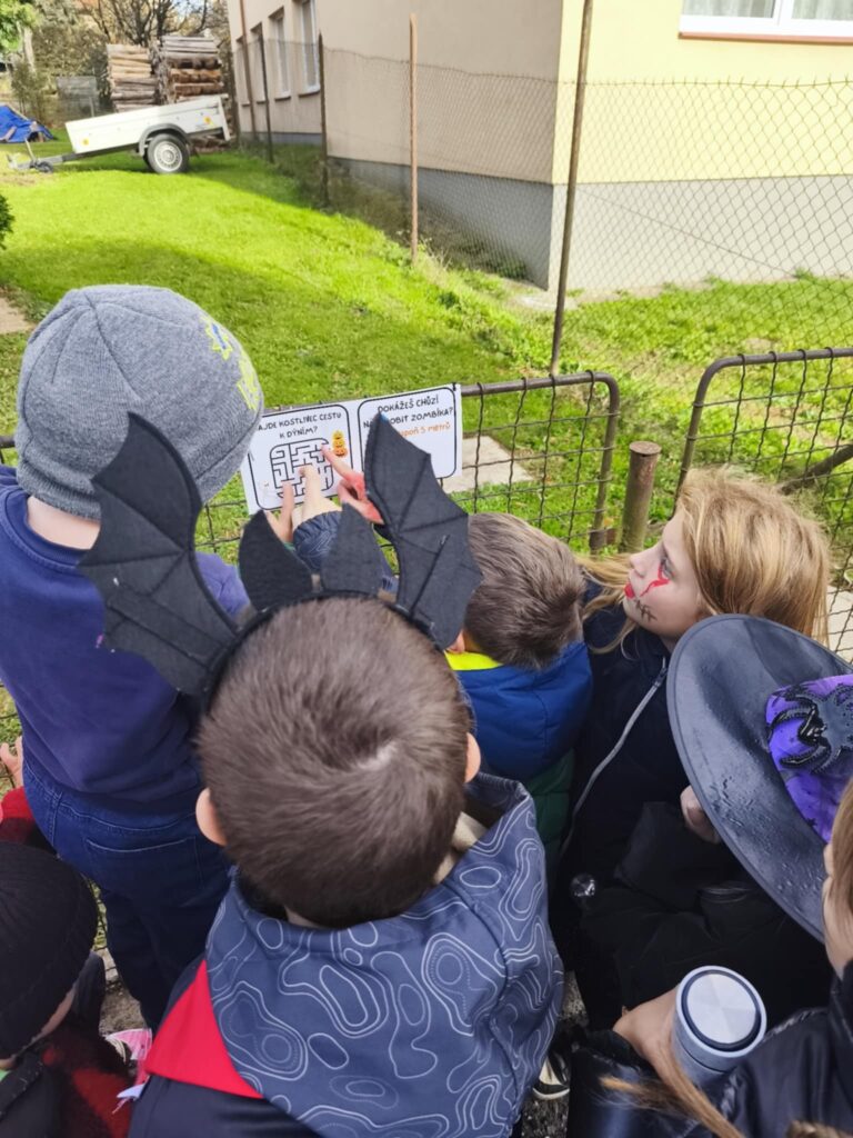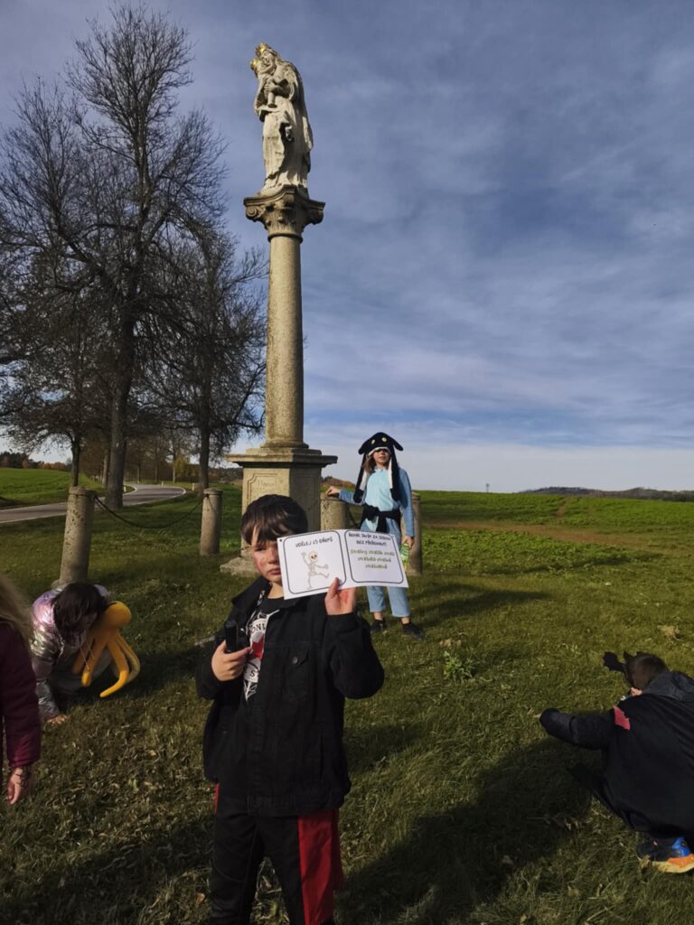 V pátek 31. října 2025 jsme pro děti z 1. stupně připravili halloweenskou šipkovanou. Trasa vedla ke Šprinclovu mlýnu, vzdálenému přibližně tři kilometry od školy. Společně jsme vyrazili po šipkách namalovaných na cestě. Tam, kde na účastníky čekal úkol, byl na zemi nakreslený otazník – děti zde našly kartičku s úkolem a společně jej plnily.