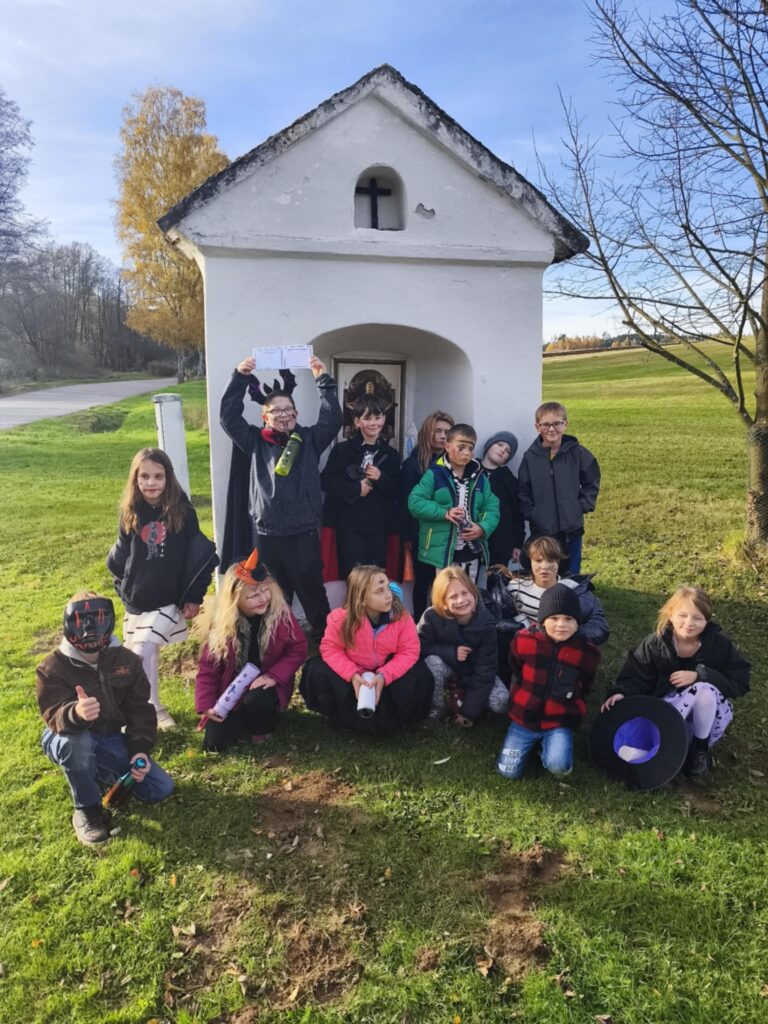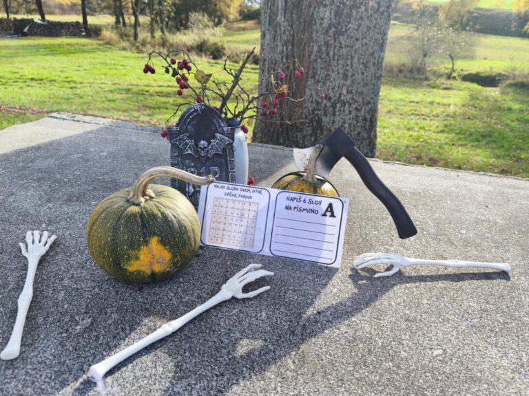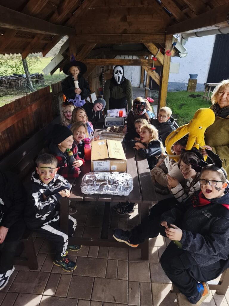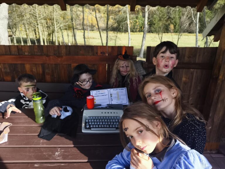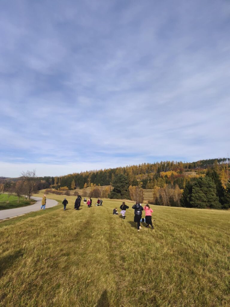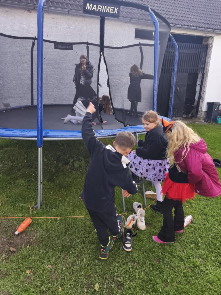 V pátek 31. října 2025 jsme pro děti z 1. stupně připravili halloweenskou šipkovanou. Trasa vedla ke Šprinclovu mlýnu, vzdálenému přibližně tři kilometry od školy. Společně jsme vyrazili po šipkách namalovaných na cestě. Tam, kde na účastníky čekal úkol, byl na zemi nakreslený otazník – děti zde našly kartičku s úkolem a společně jej plnily.