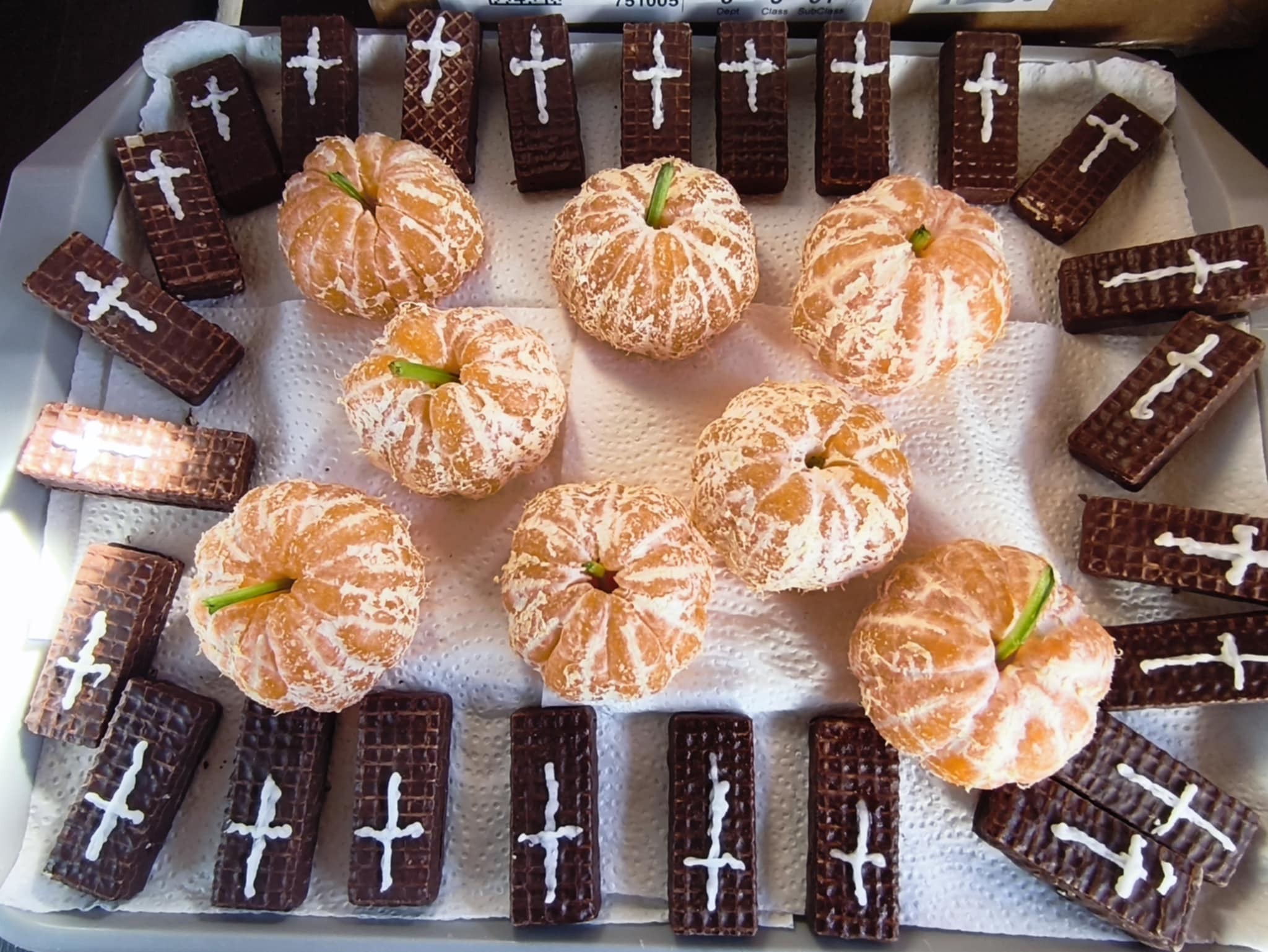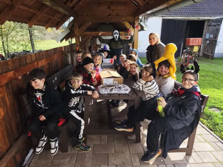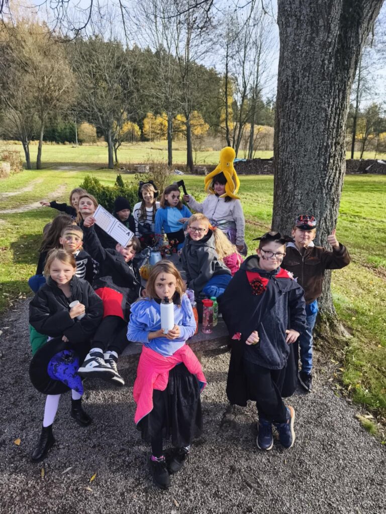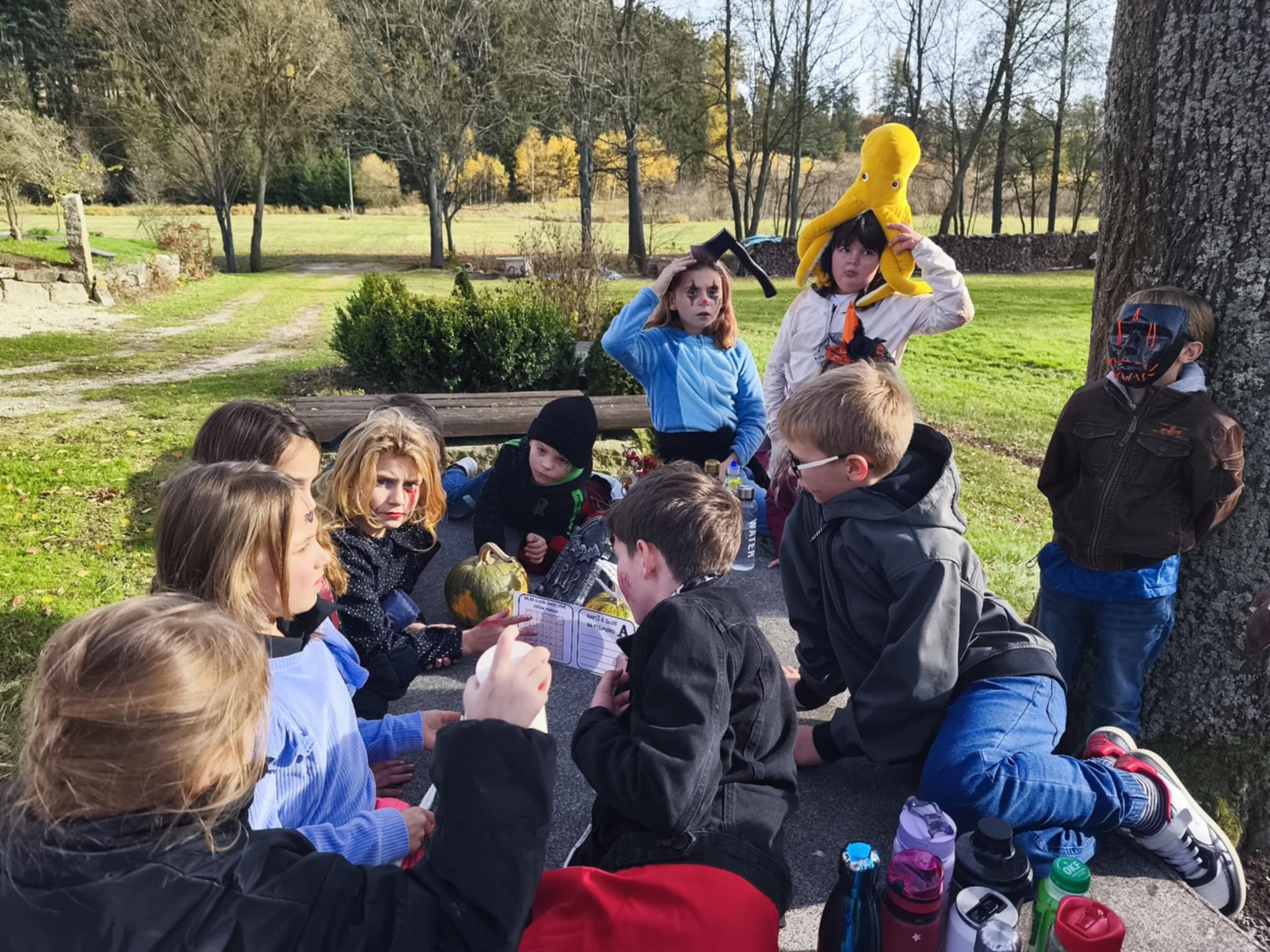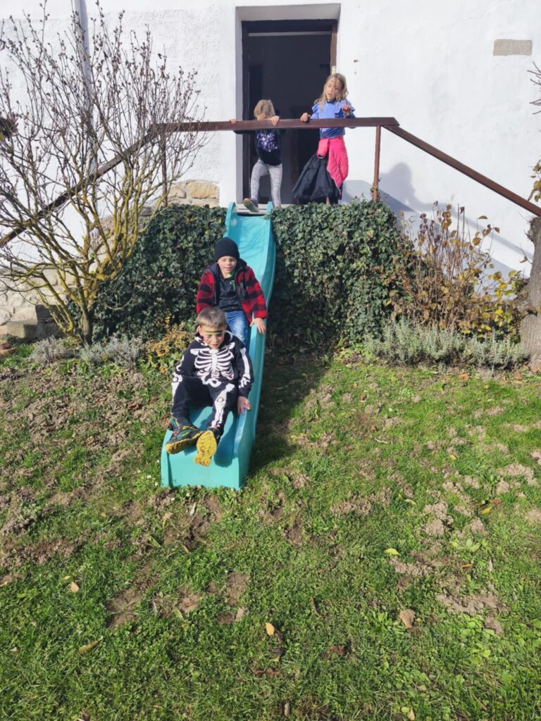 V pátek 31. října 2025 jsme pro děti z 1. stupně připravili halloweenskou šipkovanou. Trasa vedla ke Šprinclovu mlýnu, vzdálenému přibližně tři kilometry od školy. Společně jsme vyrazili po šipkách namalovaných na cestě. Tam, kde na účastníky čekal úkol, byl na zemi nakreslený otazník – děti zde našly kartičku s úkolem a společně jej plnily.