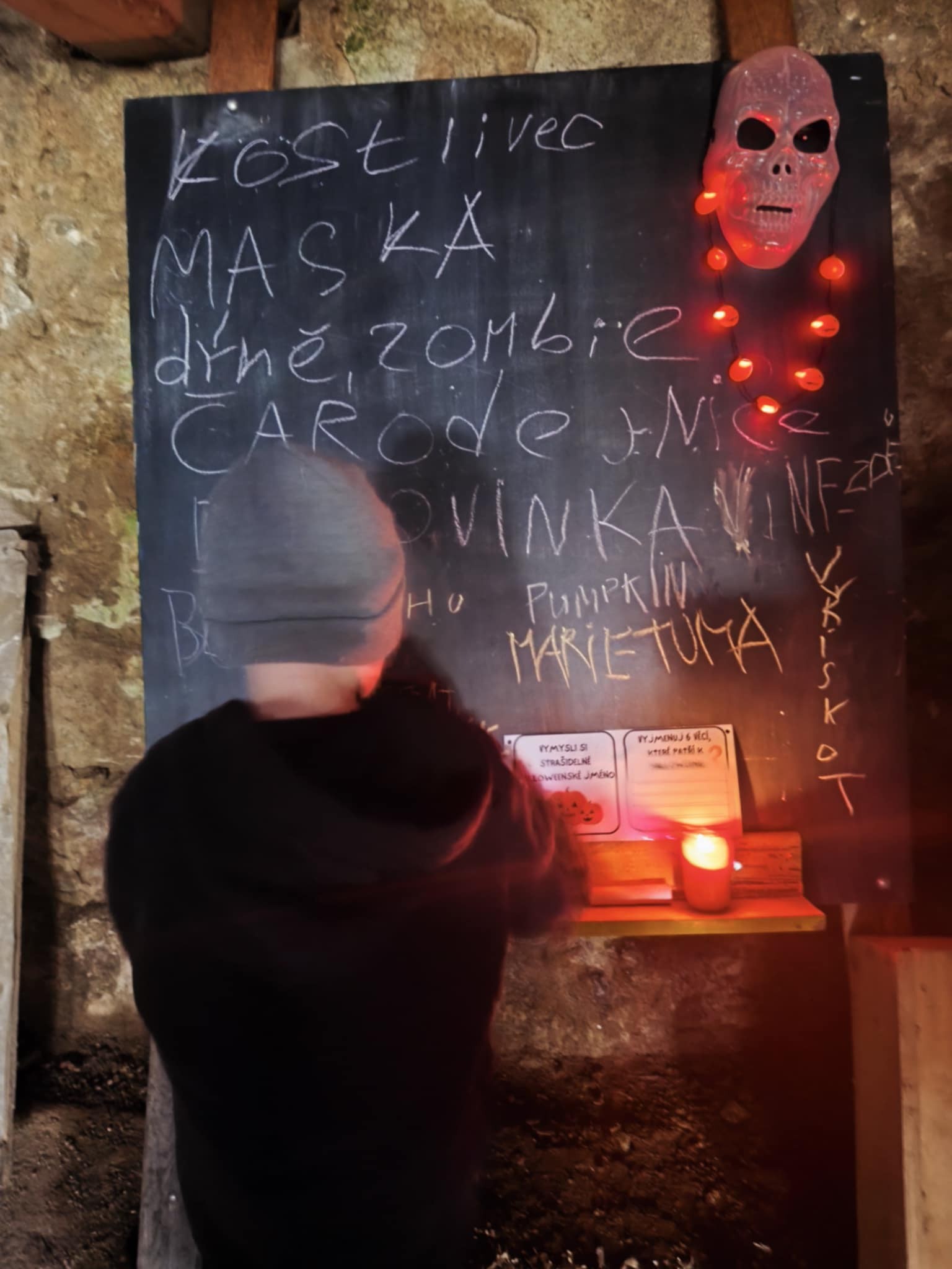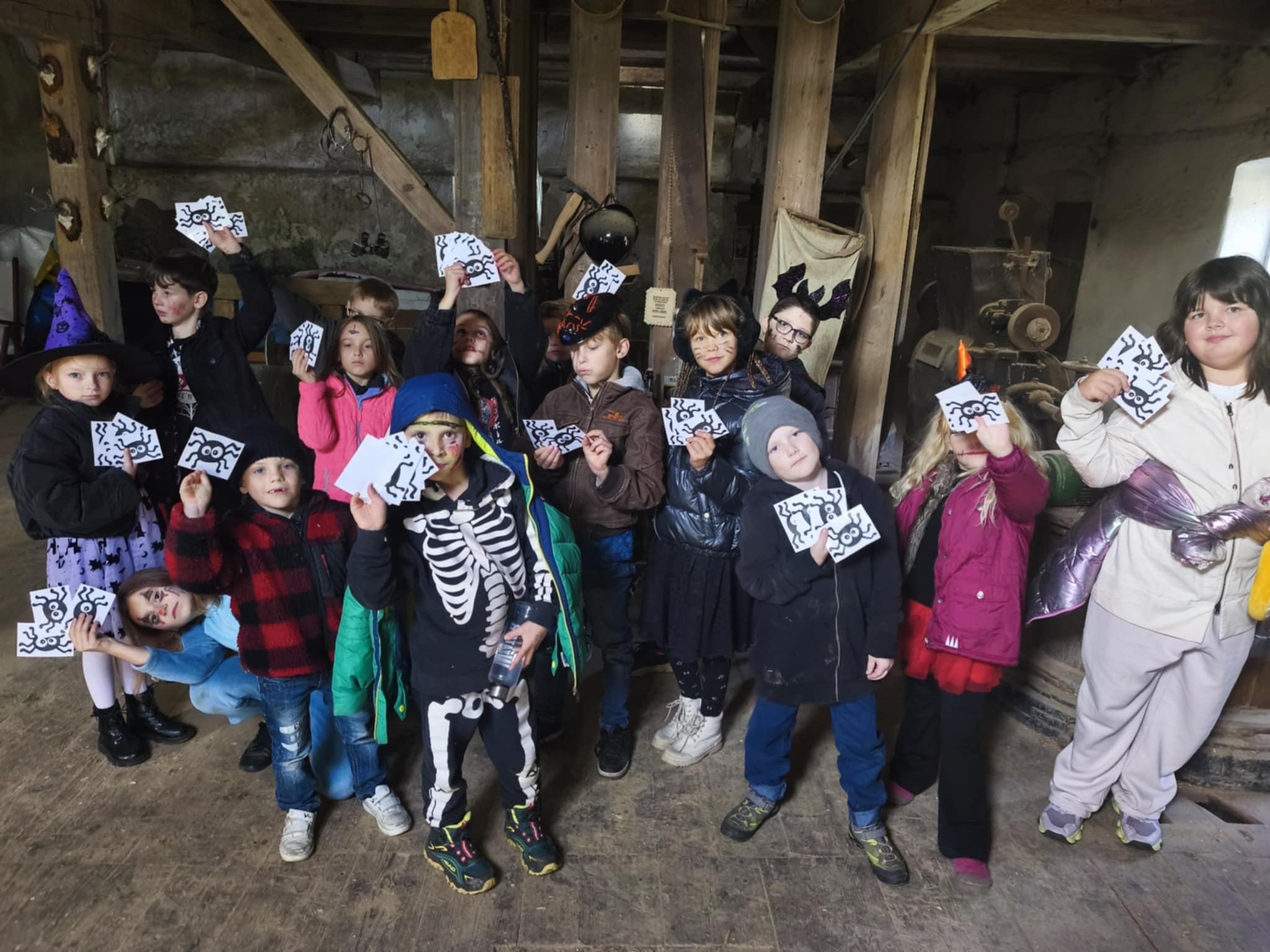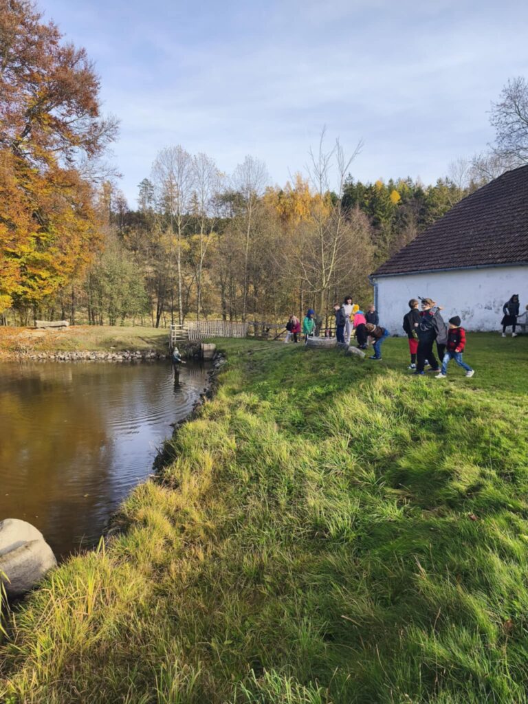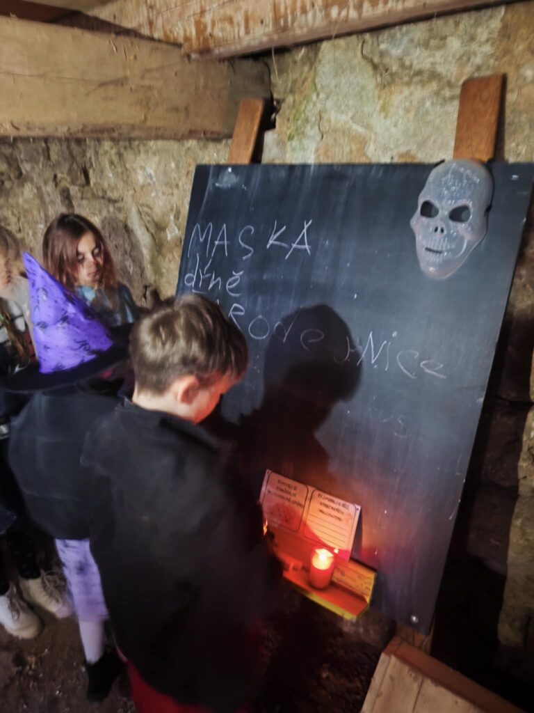 Trasa pokračovala strašidelně vyzdobenou starou mlýnicí, kde na děti čekaly další úkoly. Všechny je s nadšením plnily a užívaly si tajuplnou atmosféru. Za mlýnem u rybníka a na louce našly děti další kartičky s úkoly. Odtud jsme se pak vraceli ke kapličce a stejnou cestou zpět do školy.
